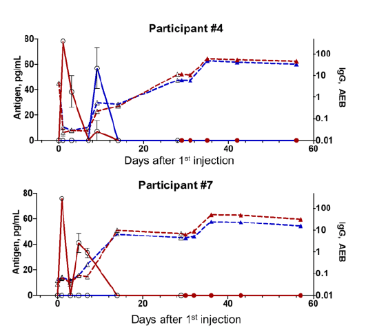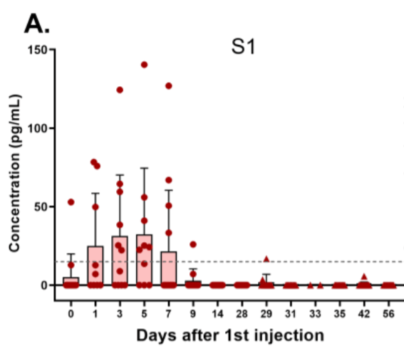 The two subunit patented protein, called a modified coronavirus spike glycoprotein, produced and shed by the subjects’ cells, based on the patented viral DNA and messenger RNA. (exception Novovax which contains the spike glycoprotein directly). This unnatural SGP appears in subjects’ circulation within a few days of the first injection. Timing after mRNA injections: both subunits of the Spike Glycoproteins appear in plasma within one day, peak at 5 days, and are undetectable in blood by 14 days (but that does not mean it is absent from many human tissues where it was produced).