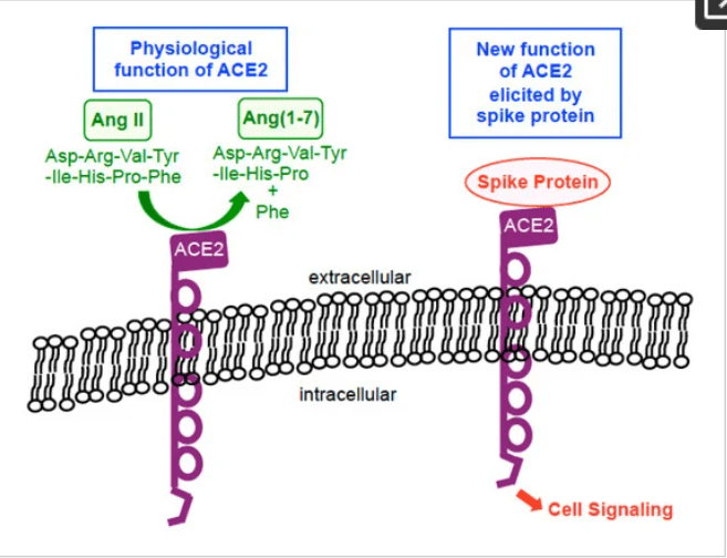 ACE2 receptors on human cells are the sites where the spike glycoproteins attach. In the case of an intact virus, following this attachment, fusion occurs, and viral content enters the cells. In the case of the artificial SGP alone, the attachment to the receptor is much stronger, and creates cell signaling which affects the cell. This includes “down-regulation” or decreasing the numbers of ACE2 receptors. The cells suffer from this as ACE2 receptors generally serve important healthy functions.