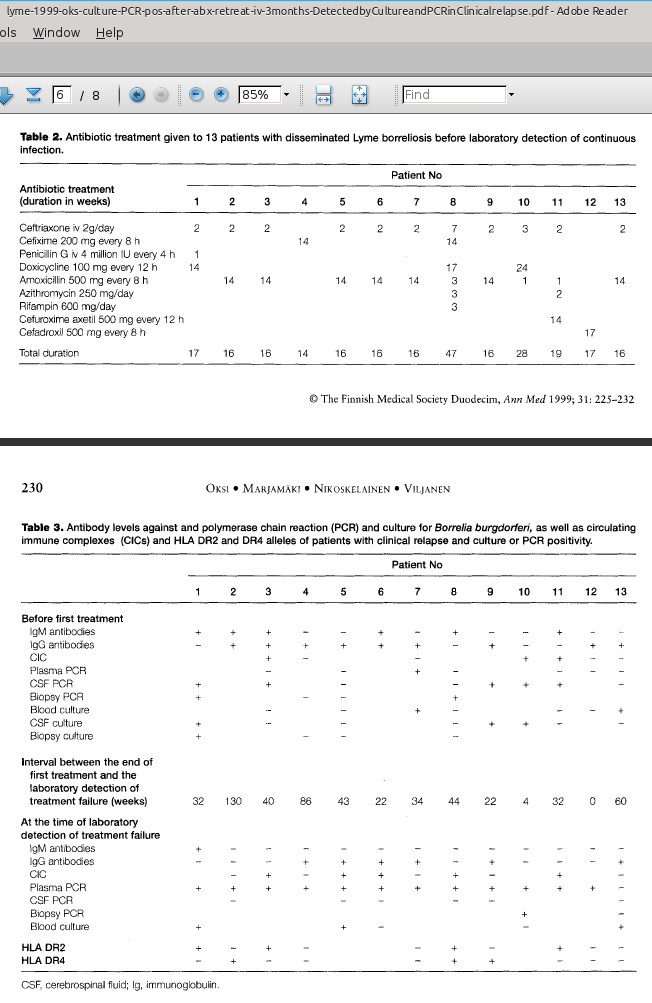 A 1998 study by Oksi et al. found that long-term antibiotic treatment led to significant recovery in 90% of patients with disseminated Lyme disease, many of whom presented with serious neurological and musculoskeletal symptoms. Patients treated with only oral cefixime (200 mg) and probenecid (500 mg) for 100 days were more likely to relapse and test positive for Borrelia DNA by a polymerase chain reaction test (PCR) months later. In contrast, those who received 2 grams of intravenous ceftriaxone for 14 days, followed by oral amoxicillin (500 mg) with probenecid (500 mg) three times daily for 100 days, had better outcomes. However, some individuals still tested positive for Borrelia DNA in their blood for many months after treatment, including one case 33 months later, suggesting that the bacteria may persist even after clinical recovery.