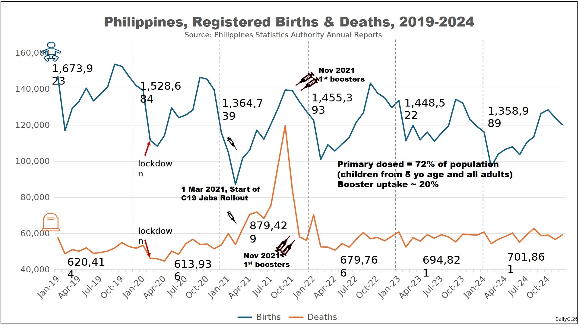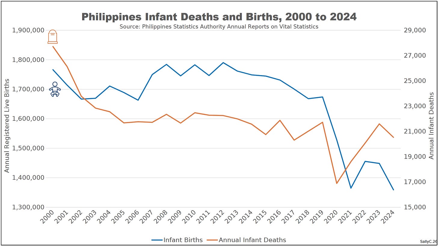 Before 2020, the Philippines’ demographic patterns followed stable and well-understood trends. Births remained relatively high compared to many Western countries, while deaths changed gradually over time in line with population growth and age structure. These patterns provide a clear baseline against which later changes become visible.