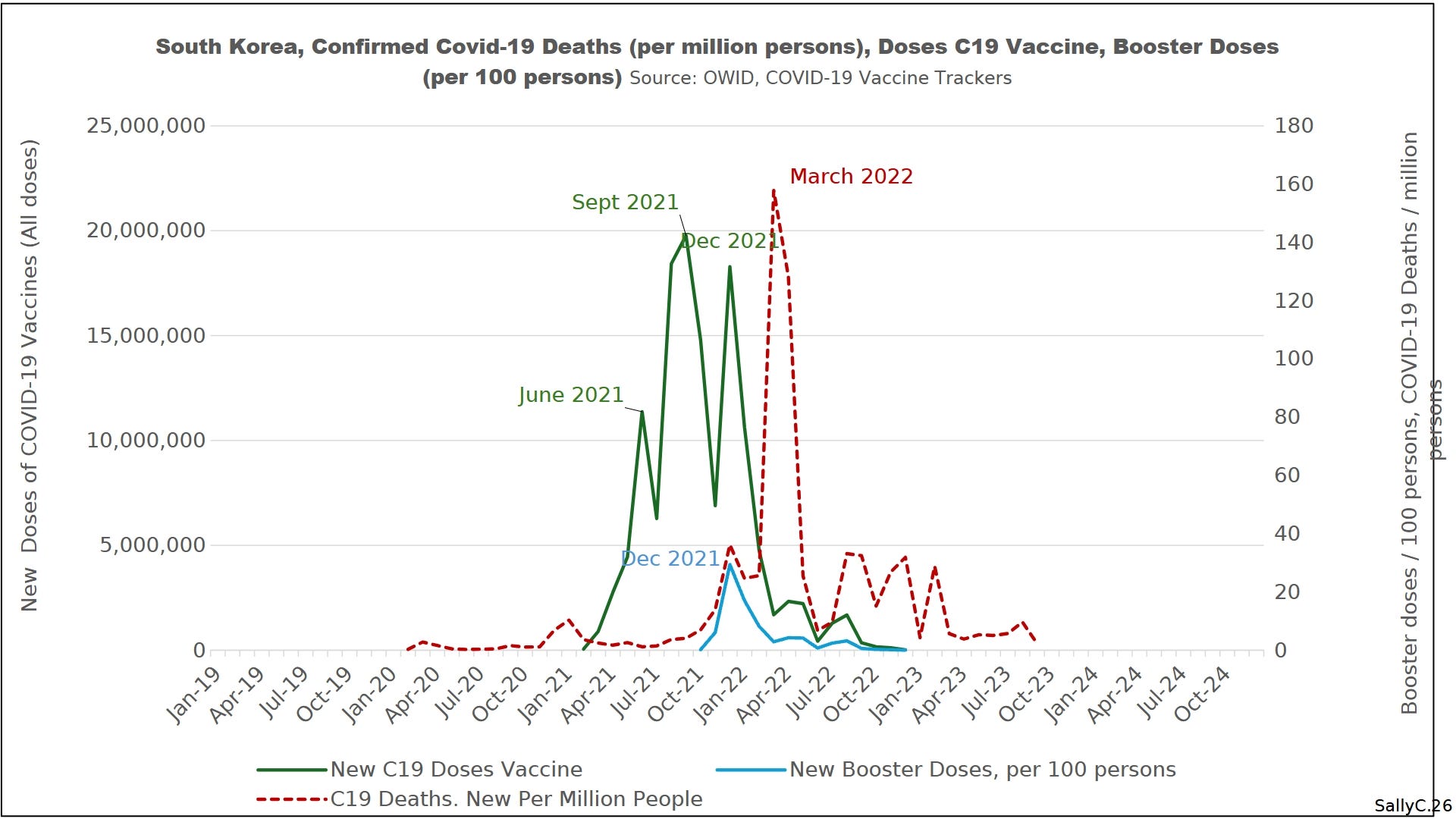 Sally Clark noted that this late-2022 surge coincided with renewed vaccination and booster promotion during the winter respiratory season, when COVID and influenza injection campaigns were combined. Rather than producing a protective effect, this period aligned with a steep rise in deaths, suggesting cumulative or compounding harm.