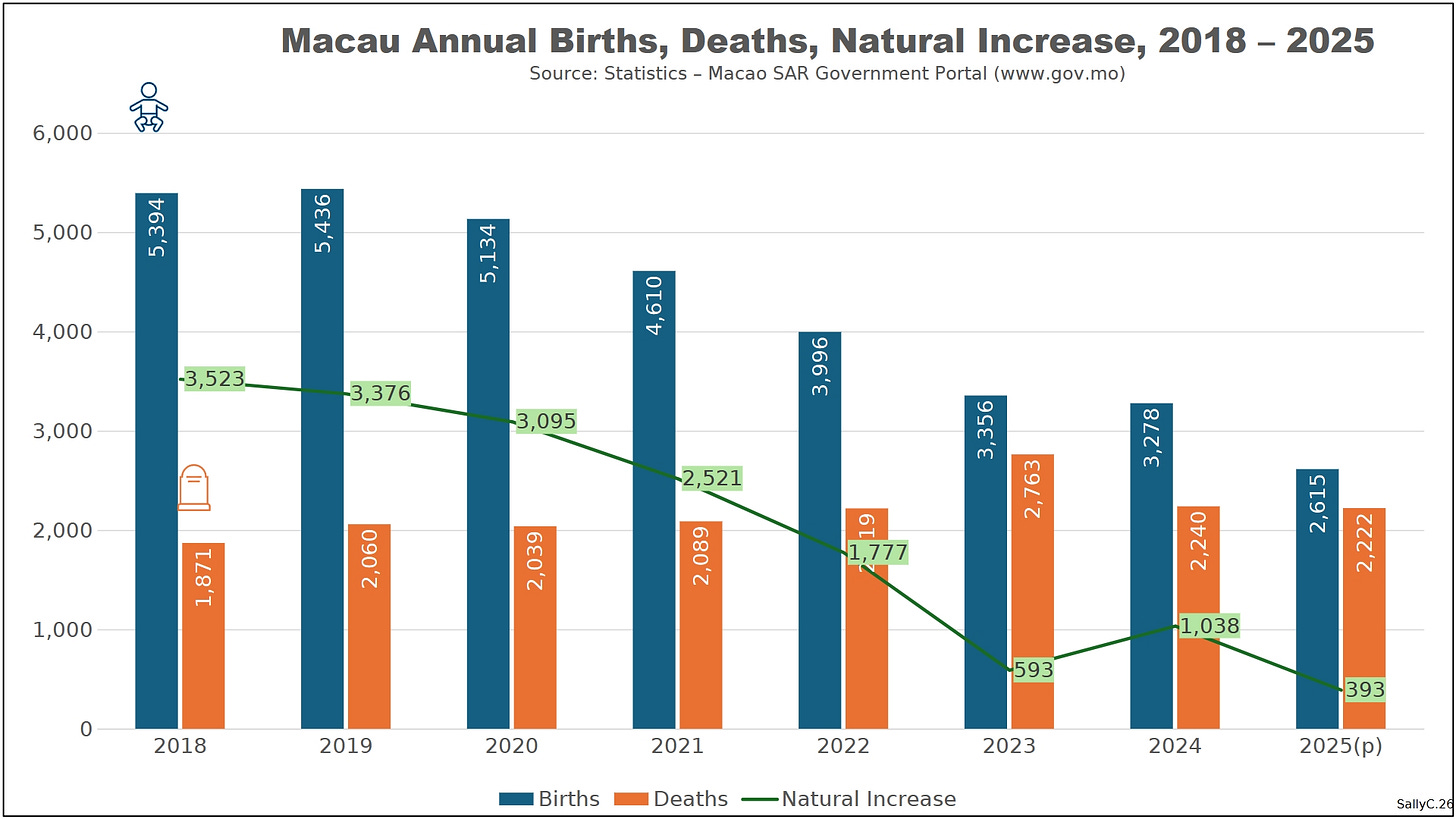At the same time, births declined more sharply than factors such as aging would predict, pushing Macau into sustained natural population loss.