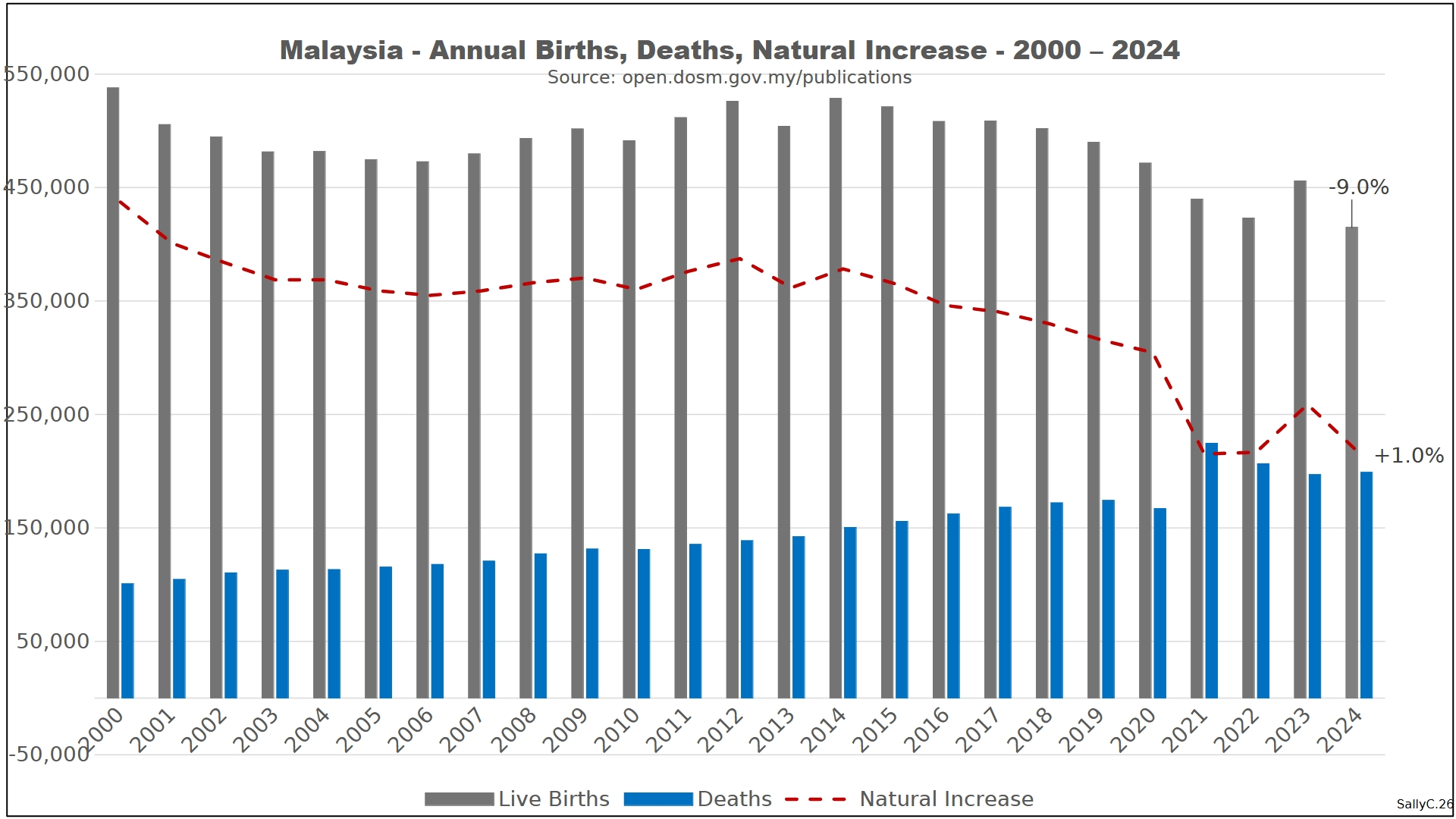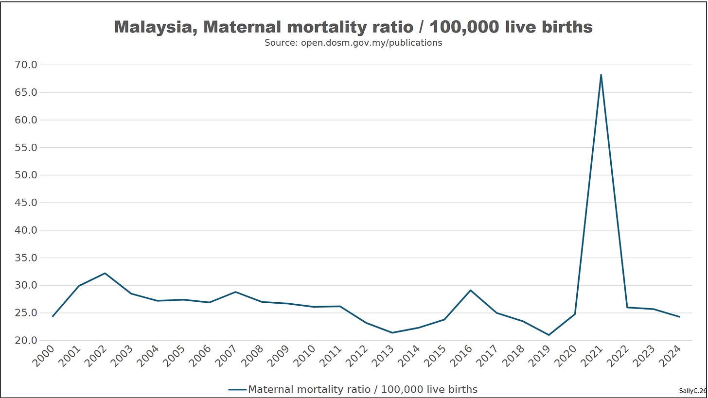 Before 2020, Malaysia’s births and deaths followed gradual, predictable trends typical of a middle-income country undergoing demographic transition. Fertility declined slowly over time, while deaths rose modestly with population growth and aging.
