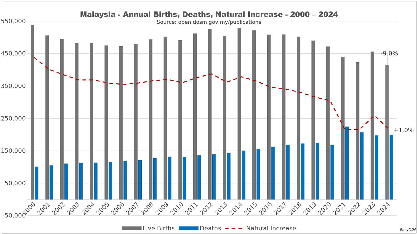 As deaths remained high and births weakened, Malaysia’s natural population growth deteriorated significantly. Clark emphasized that the sequence matters: mortality rose first after injection campaigns began, followed by falling births, mirroring the same post-2021 pattern observed across multiple regions.