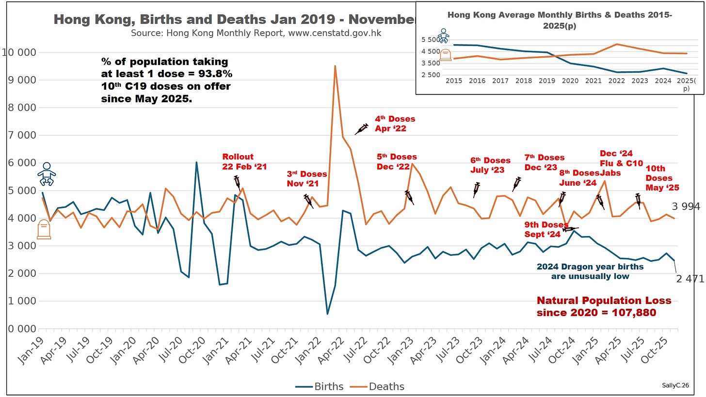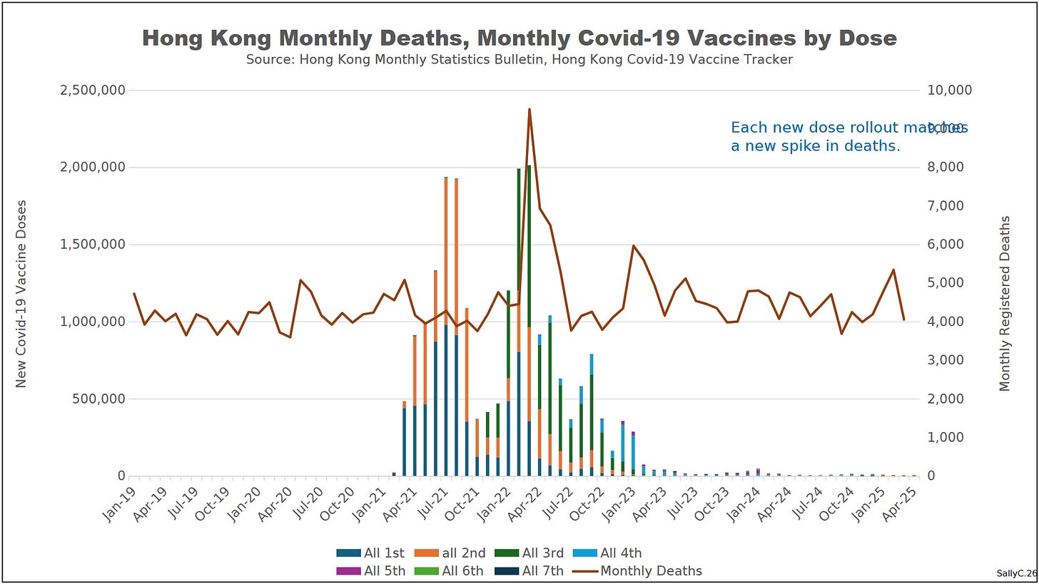 Hong Kong did not experience a dramatic increase in deaths in 2020, nor immediately following the rollout of the injections. This may reflect differences in timing, dosing, and platform, with early uptake dominated by Sinovac and later booster campaigns emphasizing mRNA products, after which mortality rose sharply and remained elevated.