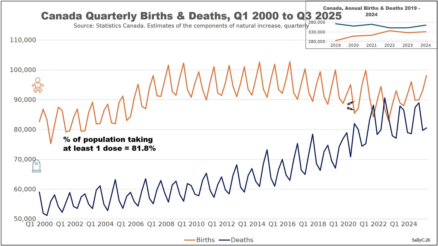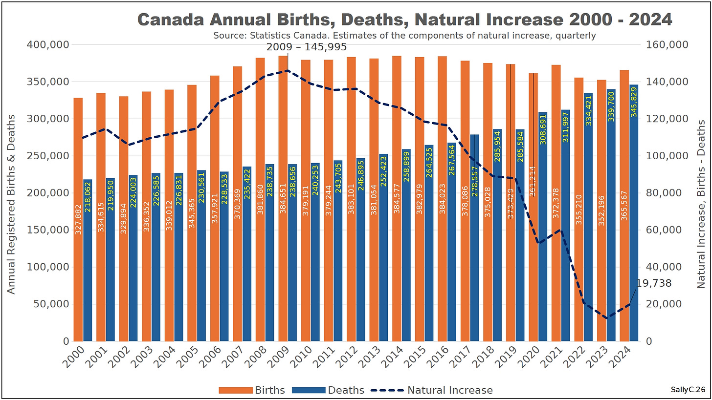 Before 2020, Canada’s births and deaths followed long-standing demographic trends typical of an aging population, with natural population growth supported in part by immigration. Despite intense public focus on the COVID “pandemic,” Canada did not experience a dramatic surge in all-cause mortality in 2020.