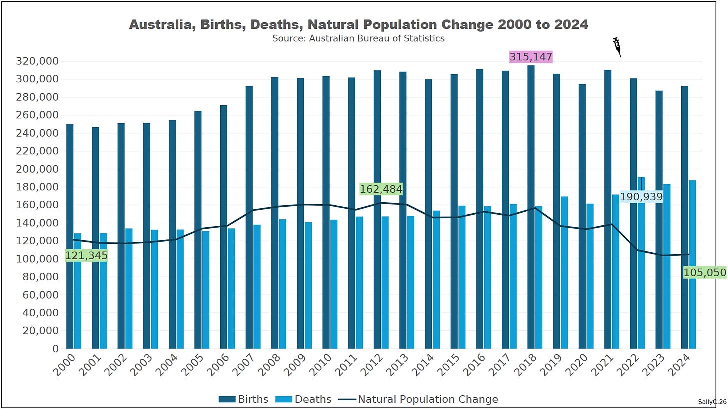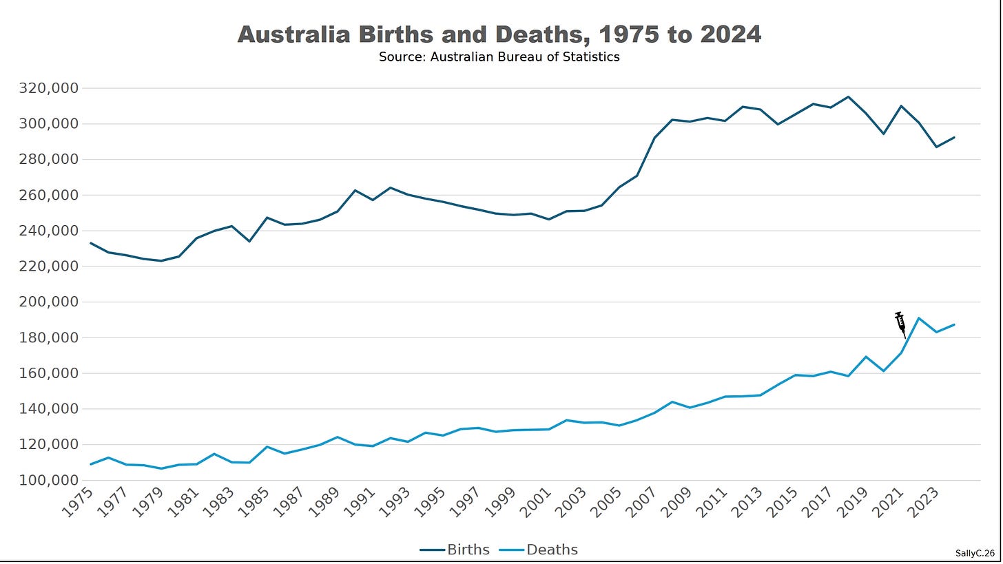As deaths rise and births fell, Australia’s natural population growth turned negative. Even with continued migration, the underlying demographic balance has deteriorated. In short, Australia’s natural population is now decreasing.