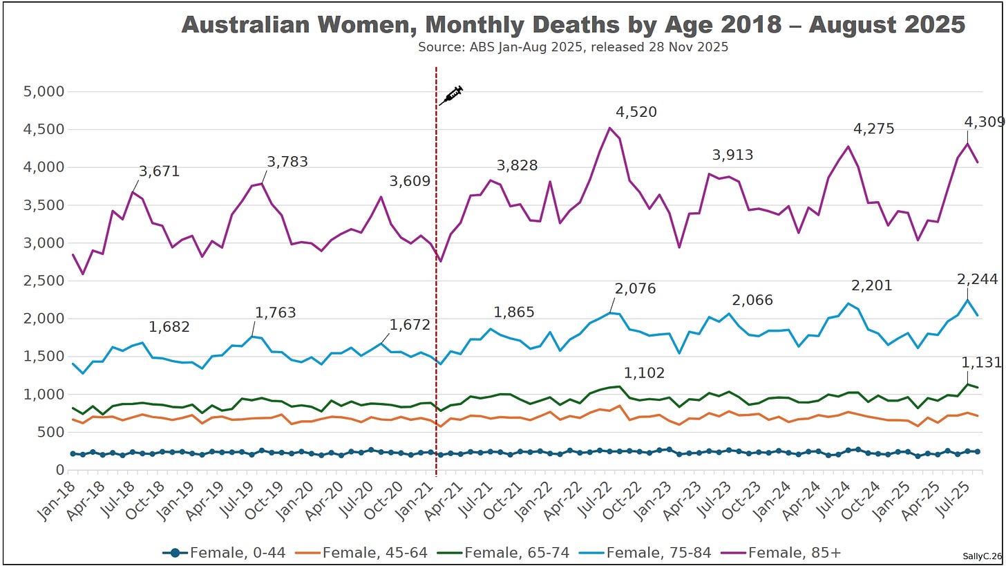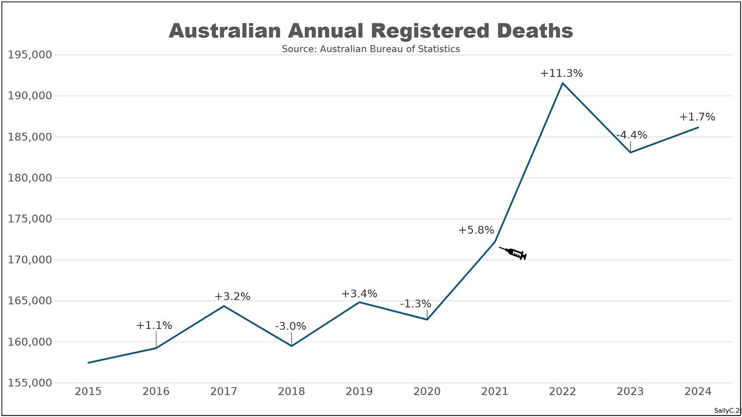 The rupture appeared in 2021, coinciding with the rollout of COVID “vaccines.” Mortality began to rise, and in 2022 deaths spiked dramatically, increasing 11.3% from the previous year, an unprecedented jump in Australia’s modern demographic record. Rather than correcting downward, mortality remained elevated thereafter, marking a permanent step change rather than a temporary fluctuation.