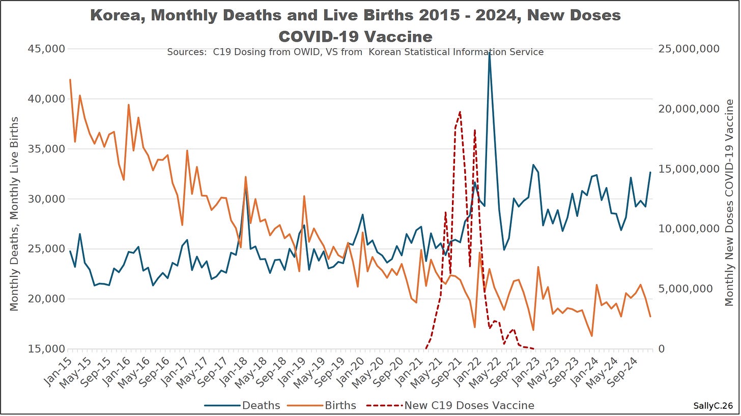 What made South Korea especially striking was what happened to births. After 2021, births fell at an unprecedented rate, dropping to historic lows well beyond previous projections. Clark highlighted that while South Korea’s fertility was already low, the post-2021 decline represented a sharp acceleration rather than a stable continuation of trend. Again, there was a slight delay in the rise in deaths, but it was still closely linked to the rollout.