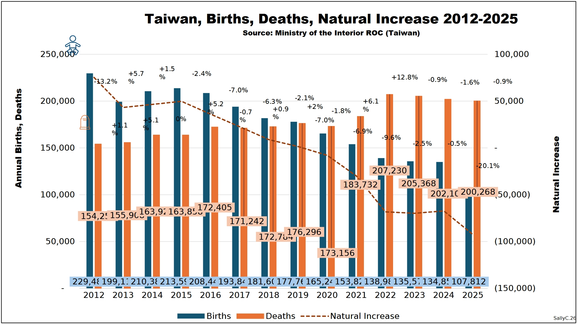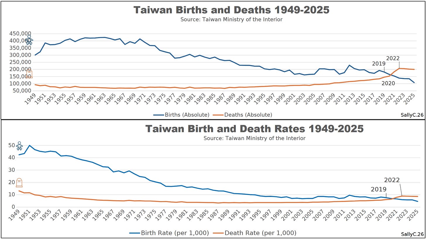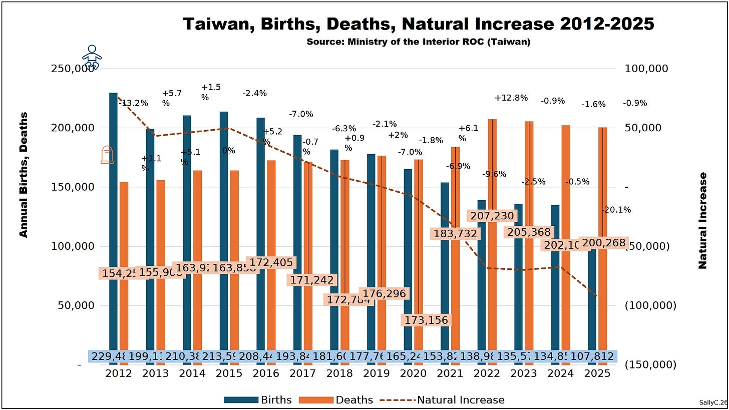 Births continued their long-term decline, but Clark noted that the post-2021 period was marked by further weakening. As rising deaths combined with already low and declining births, Taiwan’s natural population loss deepened.