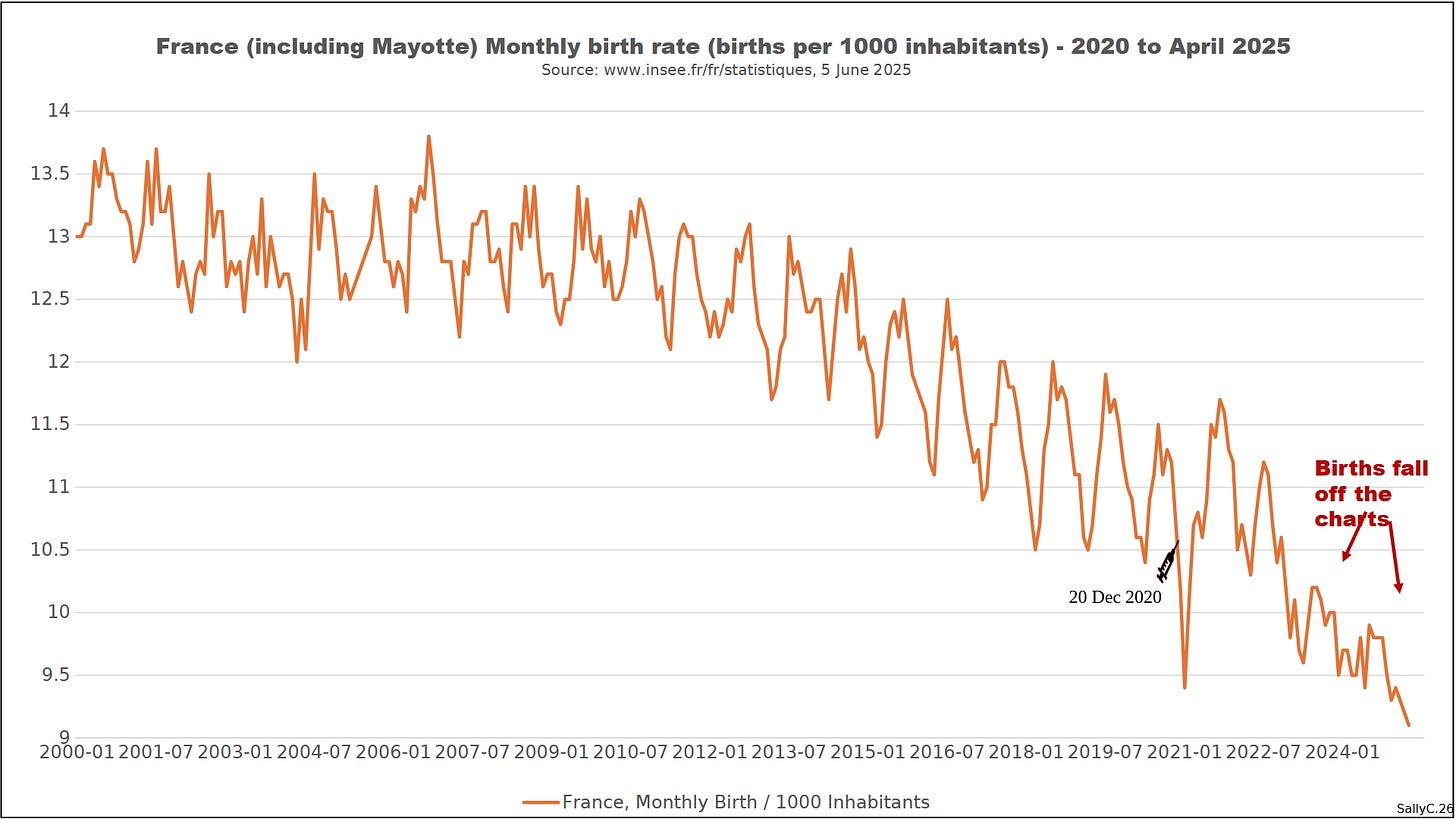 France did not experience a dramatic rise in overall deaths in 2020. The more significant changes appeared after 2021. From that point onward, births fell faster than expected based on previous trends.
