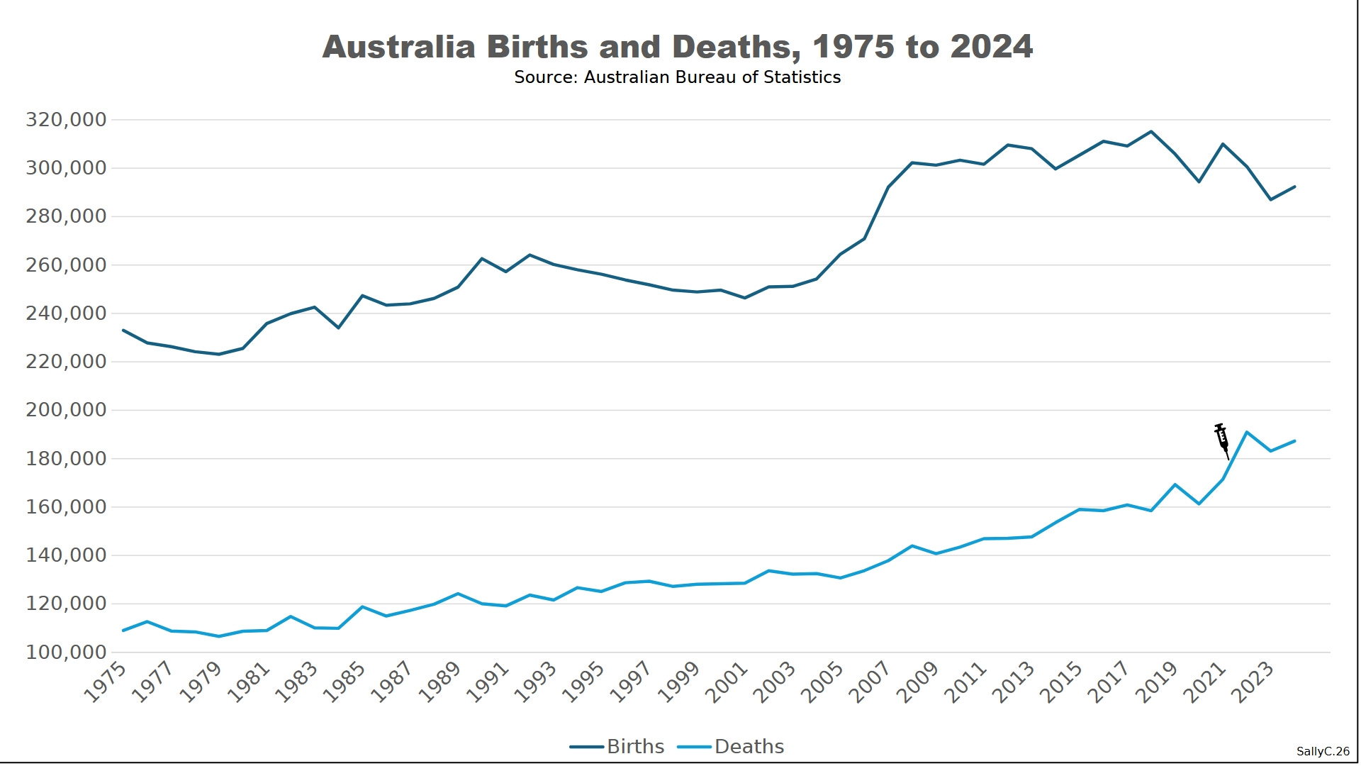 From the mid-1970s through 2019, Australia’s vital statistics followed a stable and well-understood pattern. Births and deaths rose gradually alongside population growth, while fertility remained below replacement level. This imbalance was largely offset by sustained immigration, allowing natural population change to remain positive and predictable over time.