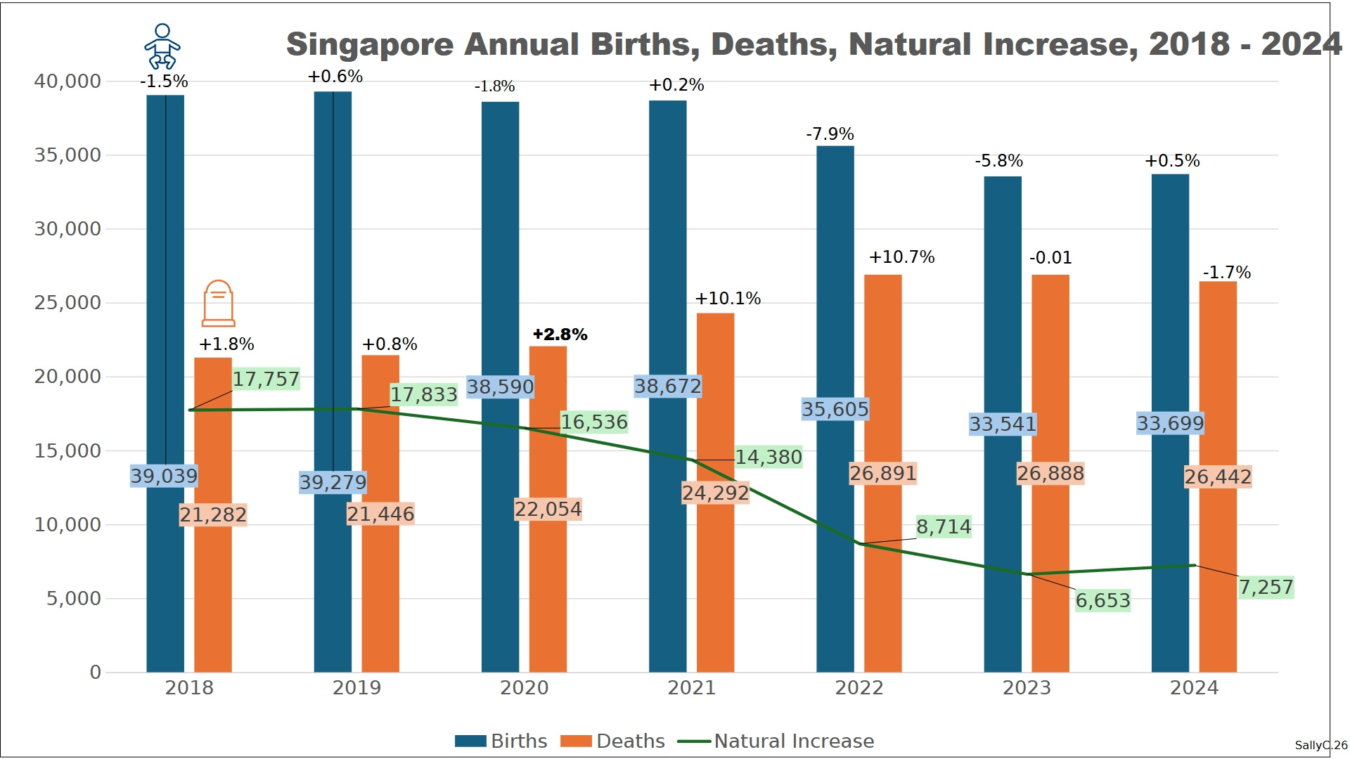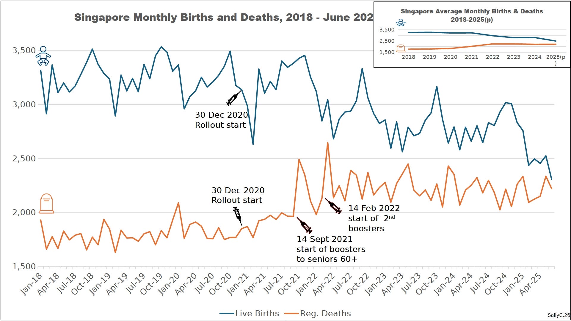 Before 2020, Singapore’s demographic trends were stable and tightly managed, with low fertility and predictable mortality in a highly regulated, high-income population. Birth and death rates changed gradually rather than abruptly, until 2021 with a large increase in deaths and 2022 with a sharp decline in births.