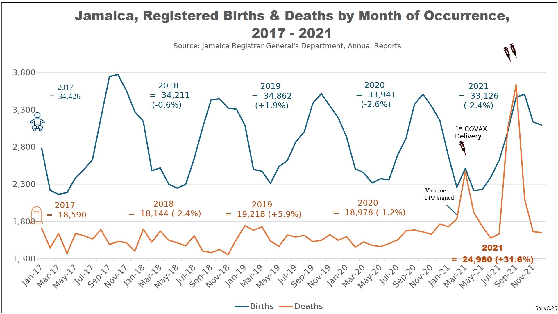 Before 2020, Jamaica’s births and deaths followed gradual and predictable trends. Birth rates declined slowly over time, while deaths rose modestly in line with population growth and aging.