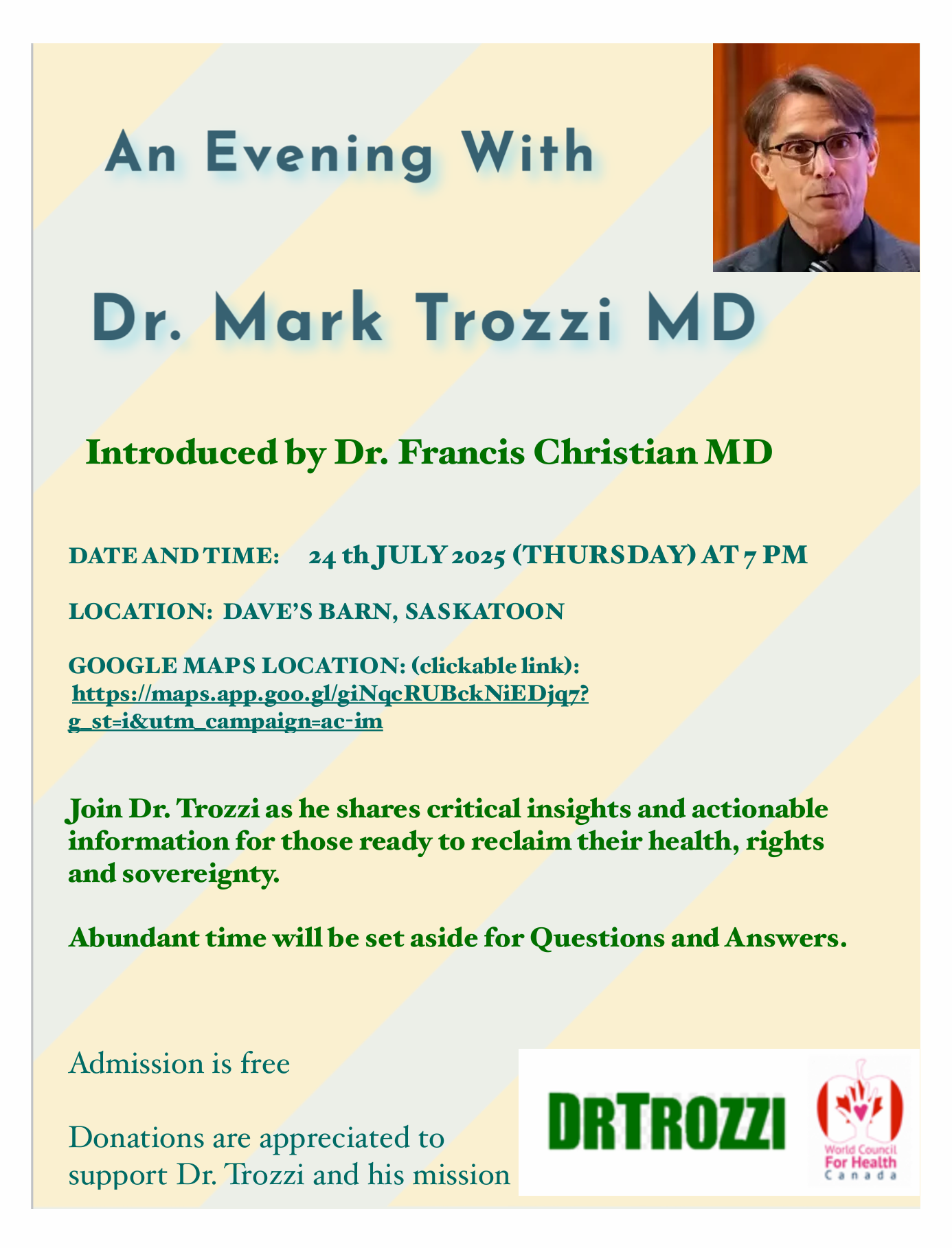 7:00 PM at Dave’s Barn (Dr. Francis Christian is also attending)(plus two more Saskatchewan dates: Swift Current and Regina at the bottom of this page)