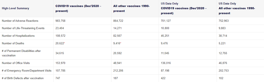 *Note that the total number of deaths associated with the COVID-19 "vaccines" is more than double the number of deaths associated with all other vaccines combined since the year 1990.
