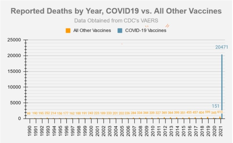 Notice that over the past thirty years, there have typically been around 300 vaccine related deaths reported per year. In just under one year, these injections have produced 20,471 reported deaths!