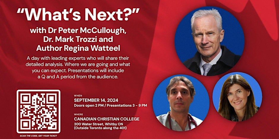 Correction: Dr McCullough, Dr Watteel, and Dr Trozzi in Whitby Ontario on September 14 (not 21st as stated in the video). Information and tickets here.