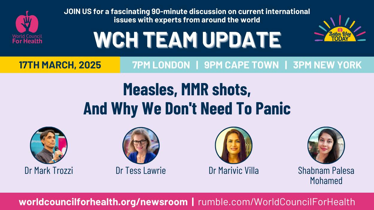 Monday’s WCH Better Way event: Join the event for a live, empowering discussion on the current measles issue, hosted by the World Council for Health. With Dr Tess Lawrie, Dr Marivic Villa, Dr James Lyons Weiler, Shabnam Palesa Mohamed, Dr Karina Aceveda Whitehouse, Dr Mark Trozzi, Francesca Havens, and Ted Kuntz.